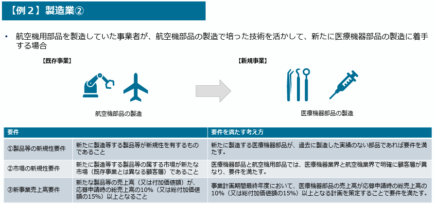 応募申請時の直近の事業年度の決算に基づく売上高が10億円以上であり、かつ、同事業年度の決算に基づく売上高のうち、新事業進出を行う事業部門の売上高が3億円以上である場合には、事業計画期間最終年度において、新たな製品等の売上高(又は付加価値額)が、応募申請時の当該事業部門の売上高の10%(又は総付加価値額の15%)以上となることが見込まれる事業計画を策定することでも、要件を満たします。